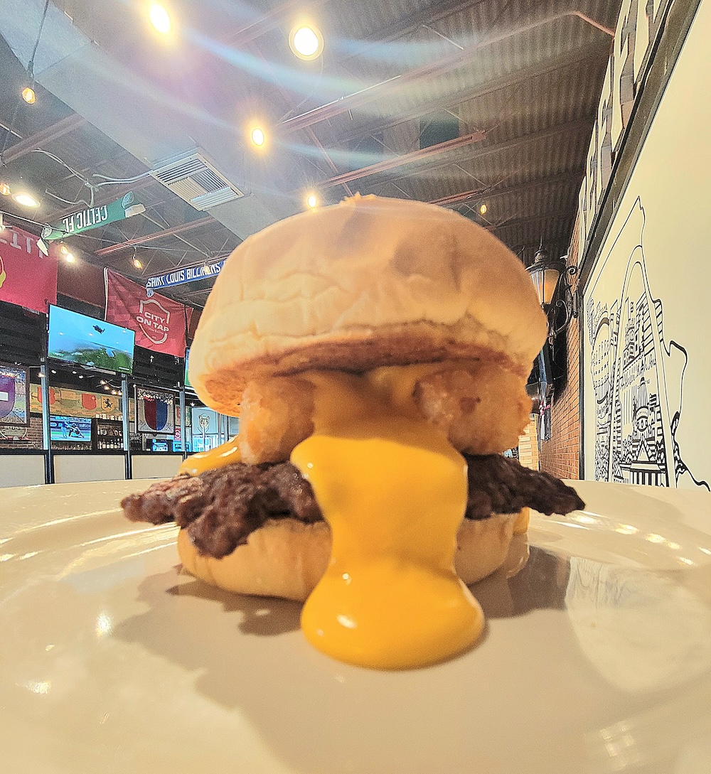 Totcho Smash — A single beef patty with tater tots and nacho cheese, all on a brioche bun.