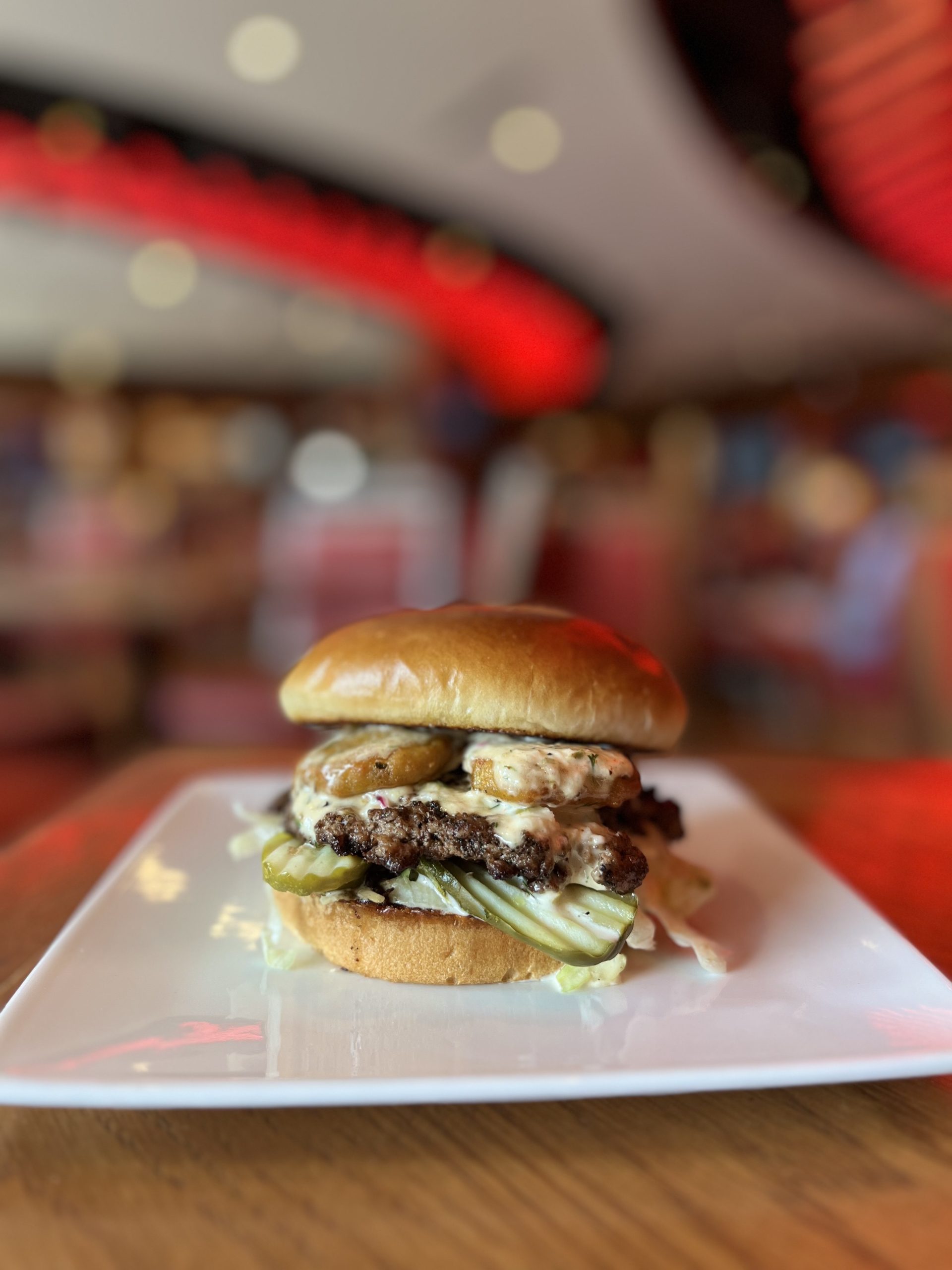 Pickle Burger — A smash burger topped with shredded lettuce, sliced pickles, spicy dill pickle remoulade, and fried pickles on a buttery brioche bun.