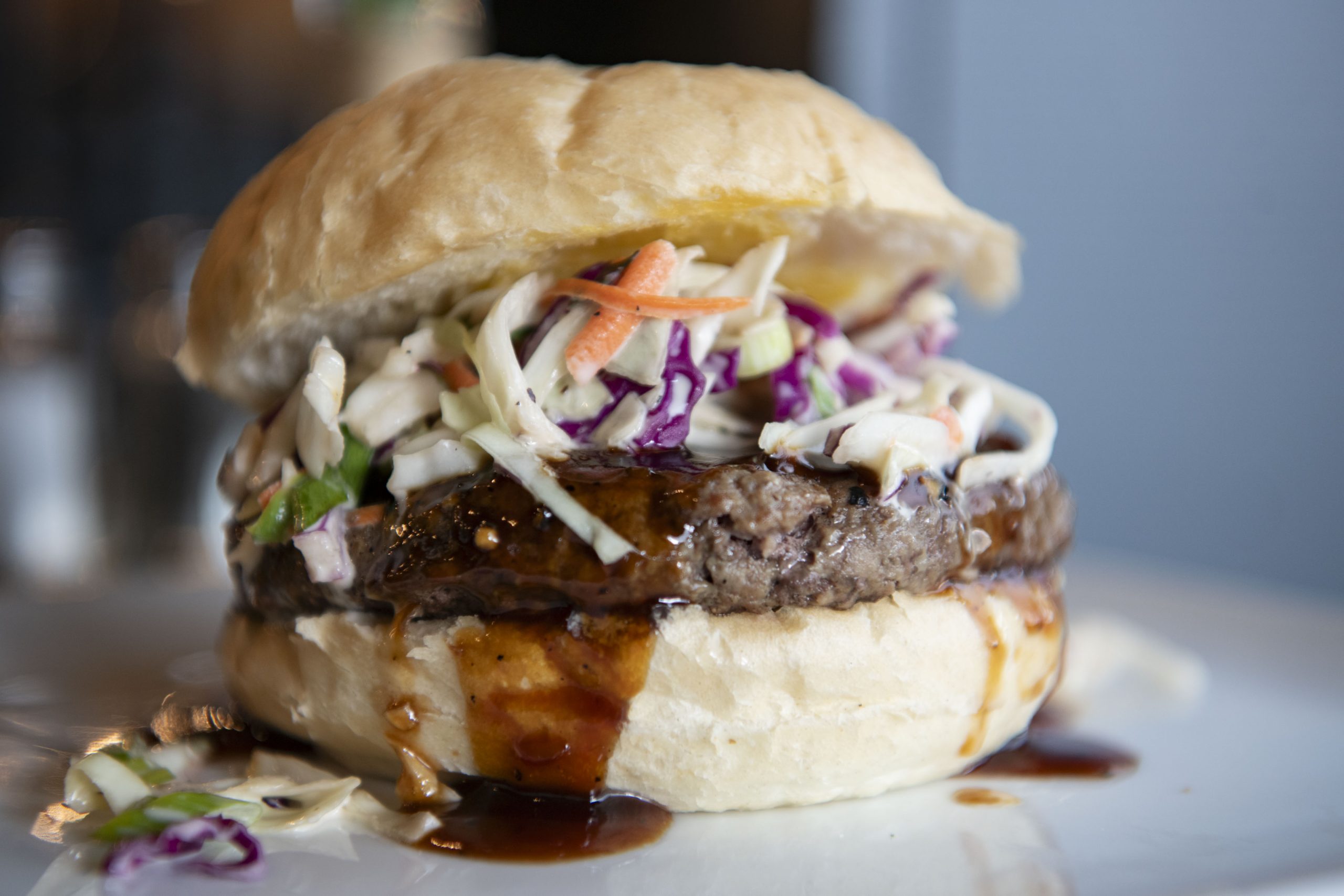 Teriyaki Burger — Grilled/seasoned 6oz burger topped with tangy teriyaki sauce and crispy Asian slaw on a Pete’s Italian Bakery bun.
