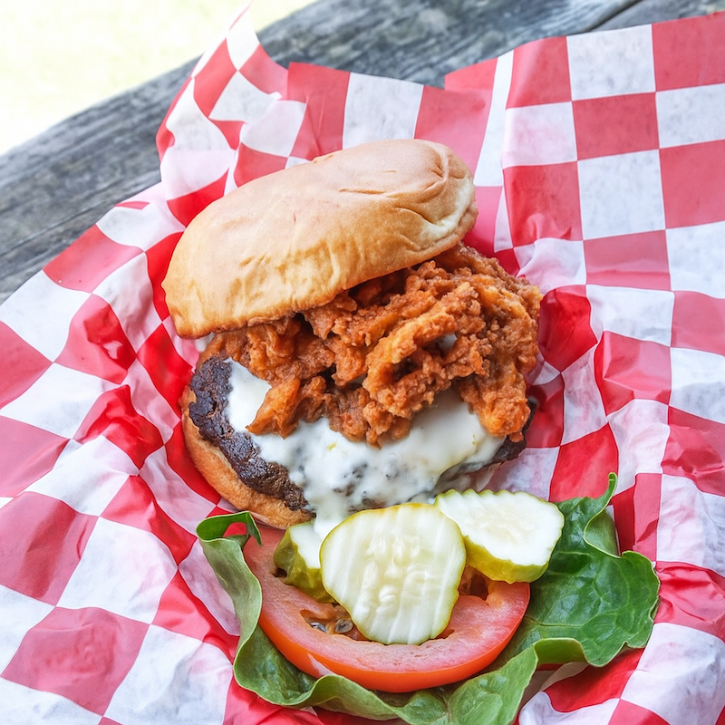 Firecracker Burger — Double smashed burger topped with house made white queso, "Firecracker-Hot" fried onions & a Sriracha ranch on a Pete's Italian bakery Bun.
